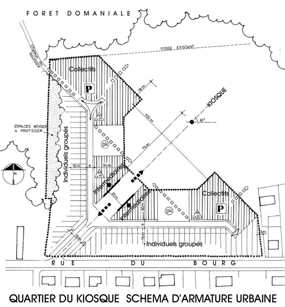 Mise au point d’un schéma d’armature urbaine pour la réalisation d’un quartier de logements sociaux de type PLA et PLI , soit une centaine environ. Les logements s’organisent en 5 unités différenciées: