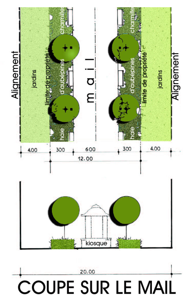 Ce schéma structuré autour d’une prairie et d’un ancien kiosque préservé , libère pour tous les habitants des vues et accès vers la prairie, les jardins privatifs clos étant réservés aux franges du quartier.