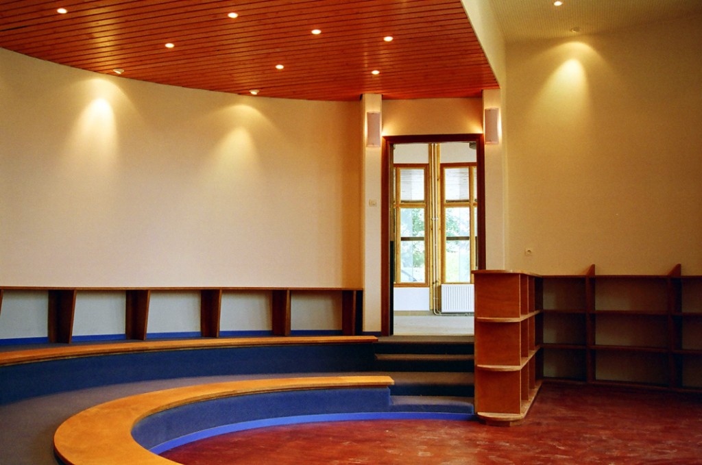 La bibliothèque s’inscrit au cœur de l’école dans un tambour avec gradins en hémicycle, parquet et plafond bois.