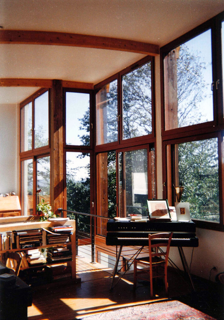 La façade Sud sur jardin très largement vitrée s’ouvre sur une clairière et le paysage lointain.