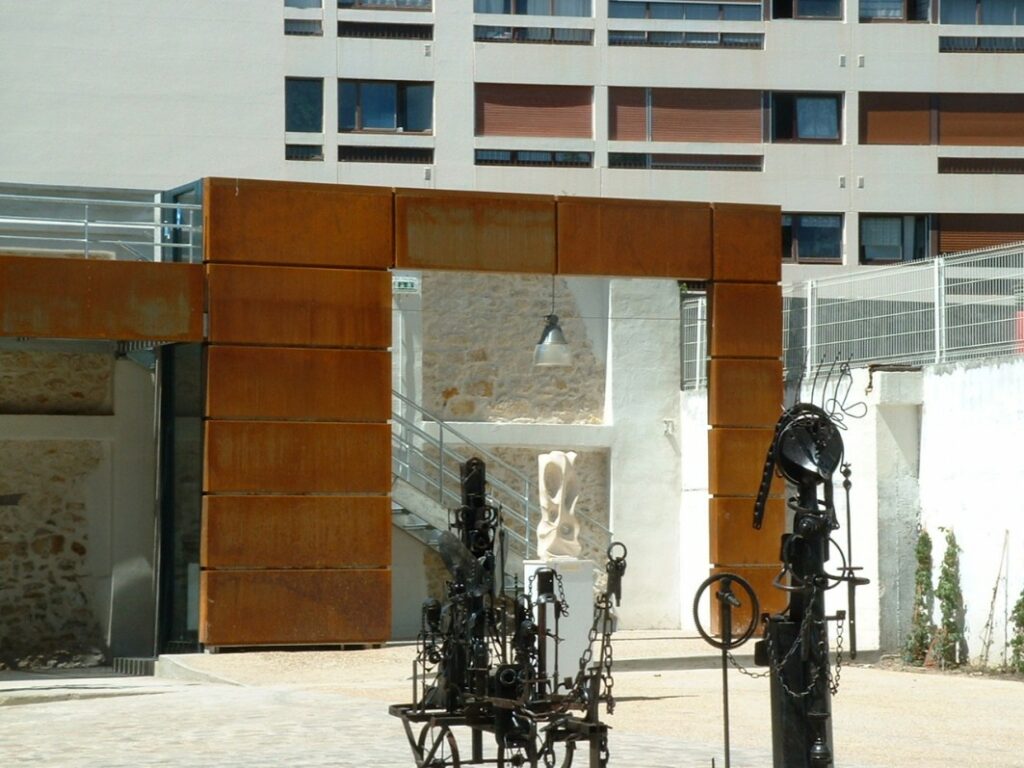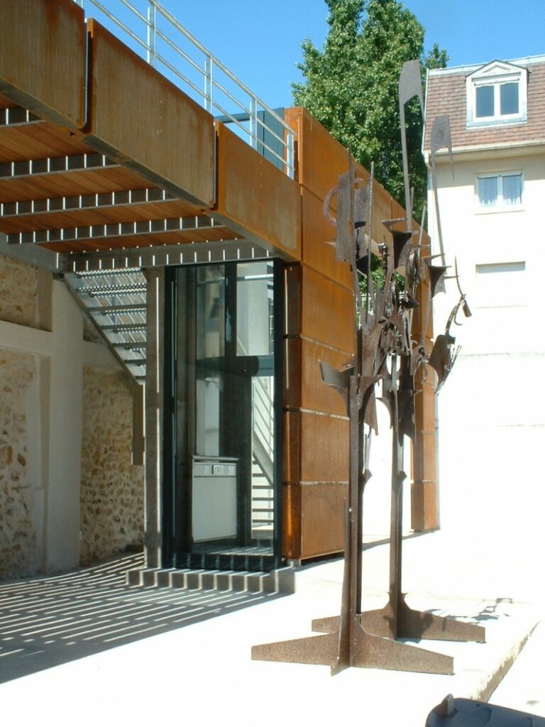2000, reprises de structure, fondations, poteaux, ouverture des baies.Création à rez de chaussée de trois ateliers d’art plastique traversants,desservis en accès direct sur la cour intérieure .Regroupés autour d’un hall, ils communiquent par des parois coulissantes et bénéficientde mobilier intégré et de panneaux d’affichage en bois.2004 : aménagement sur site occupé de l’étage et des espaces extérieurs.Création d’une salle d’expositions de plus de 200 m²,dans un volume sous rampant baigné d’une lumière zénithale filtrée par des vantelles bois intérieures.