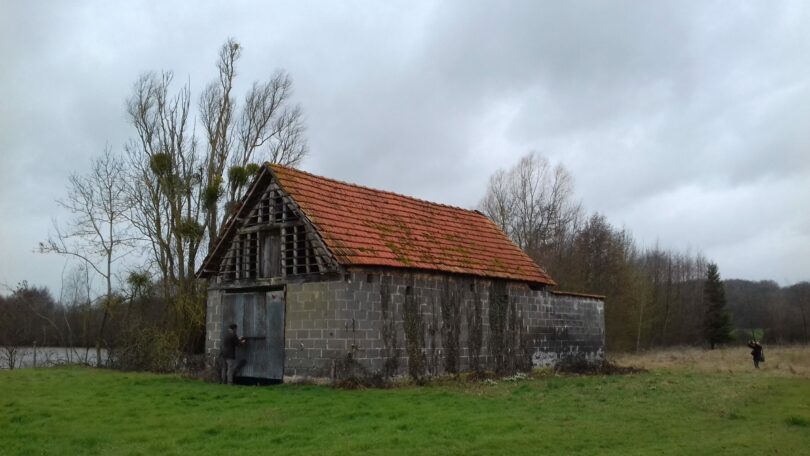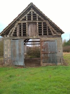 Situé dans la friche d’entrée, le bâtiment concerné est visible depuis la route au travers d’une haie bocagère qui double les clôtures. L’emprise bâtie est rectangulaire de 120 m² environ, implantée à 18 m de la voie et à 10 m de l’étang,