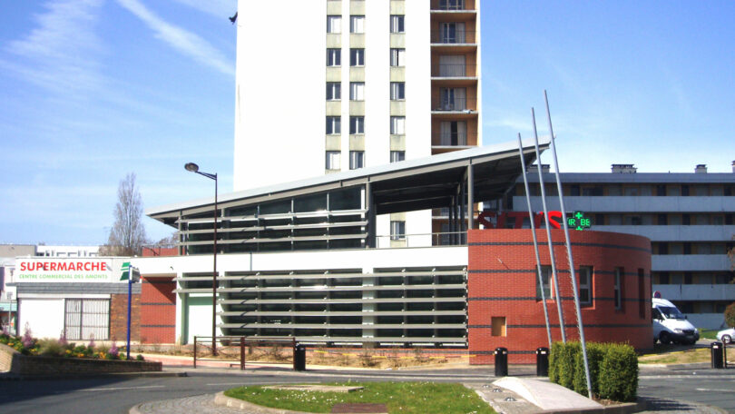 La façade des services internes, plus maçonnée est revêtue de plaquettes de grés cérame, colorées, anti-tags et dans la continuité du centre commercial existant.