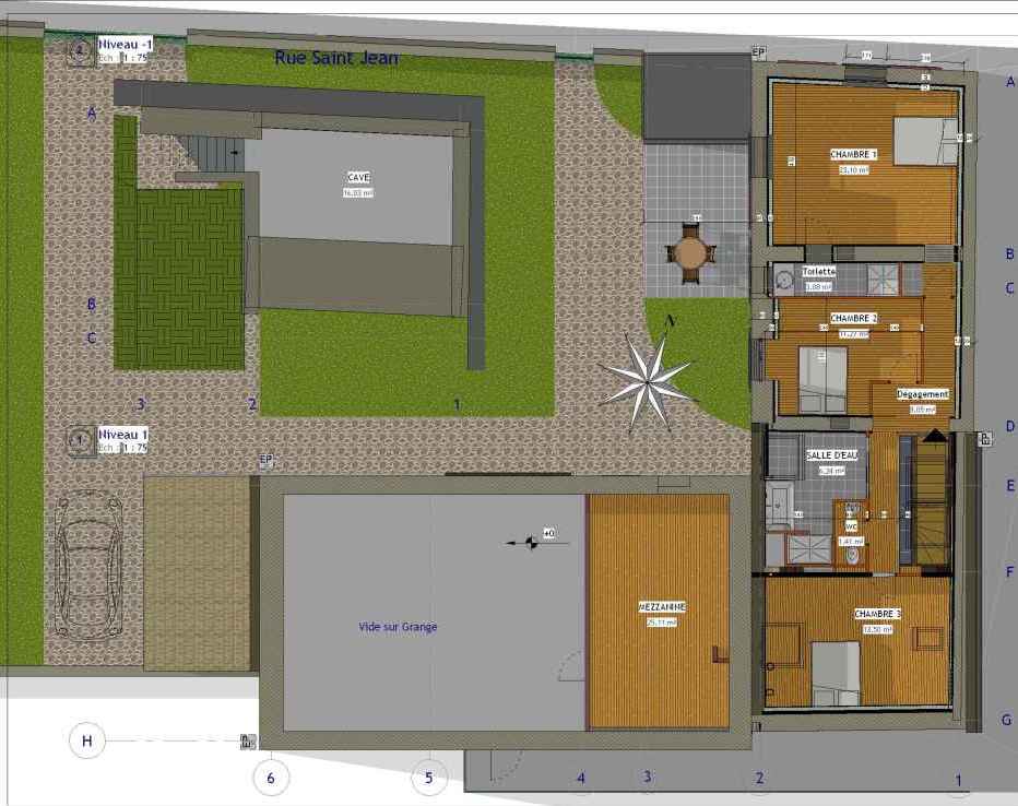 - démolition partielle de la véranda pour obtenir un appentis simplement adossé au mur de clôture : maintien de la façade en pierre sur la rue Saint Jean, et complément en maçonnerie enduite et brique sur jardin, couverture en zinc patiné faiblement penté à 11° pour plus de discrétion